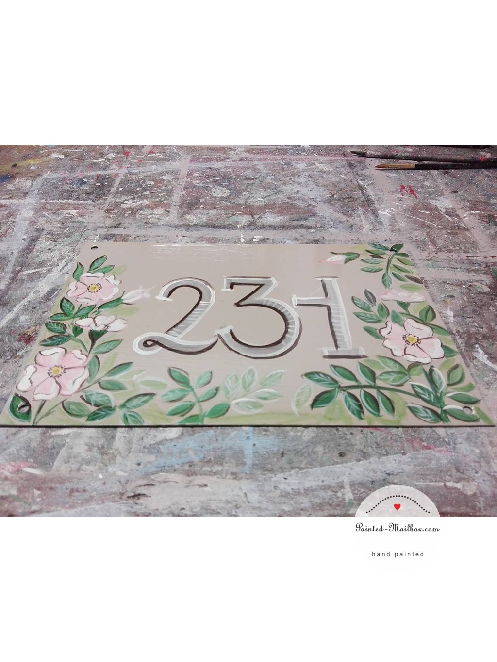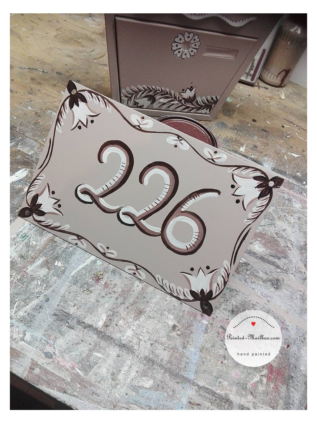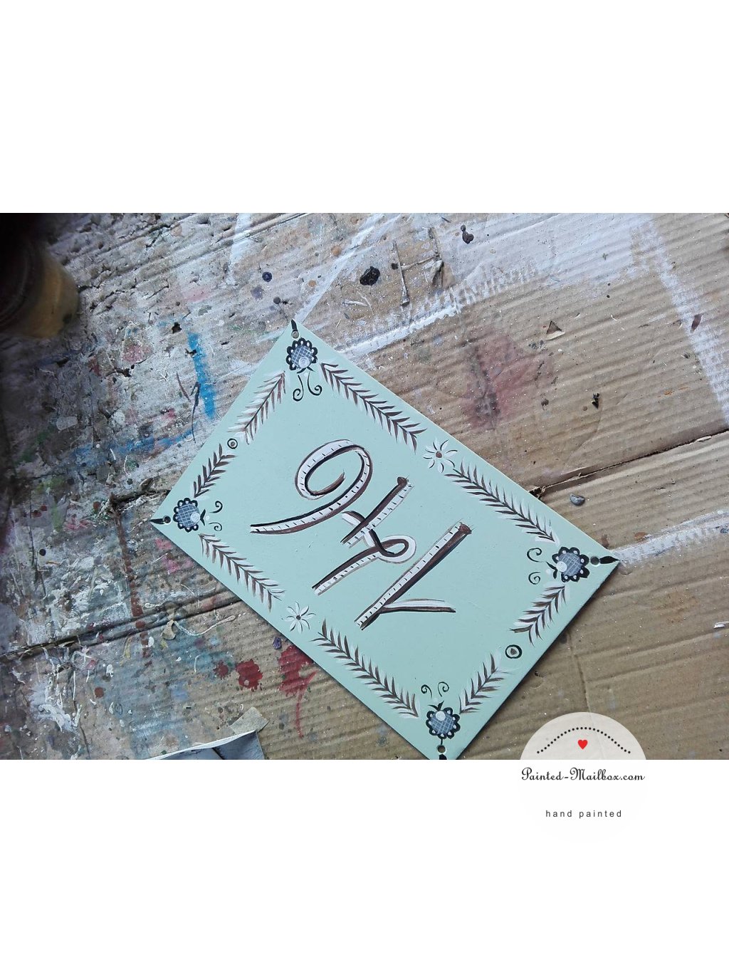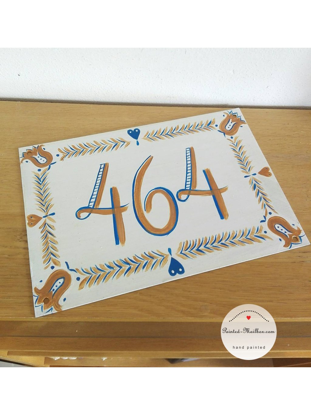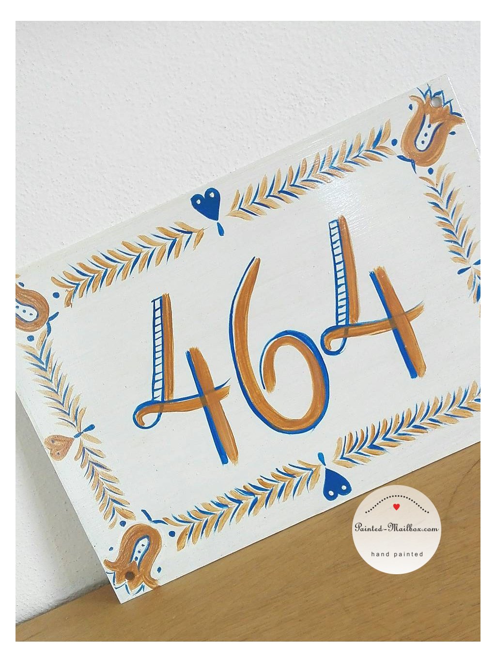 In the same design as your painted mailbox, I will gladly paint a house number or other table (Welcome, etc.) at your request. The size of the steel sheet is 20 x 30 cm / 7,87 x 11,81 inch.