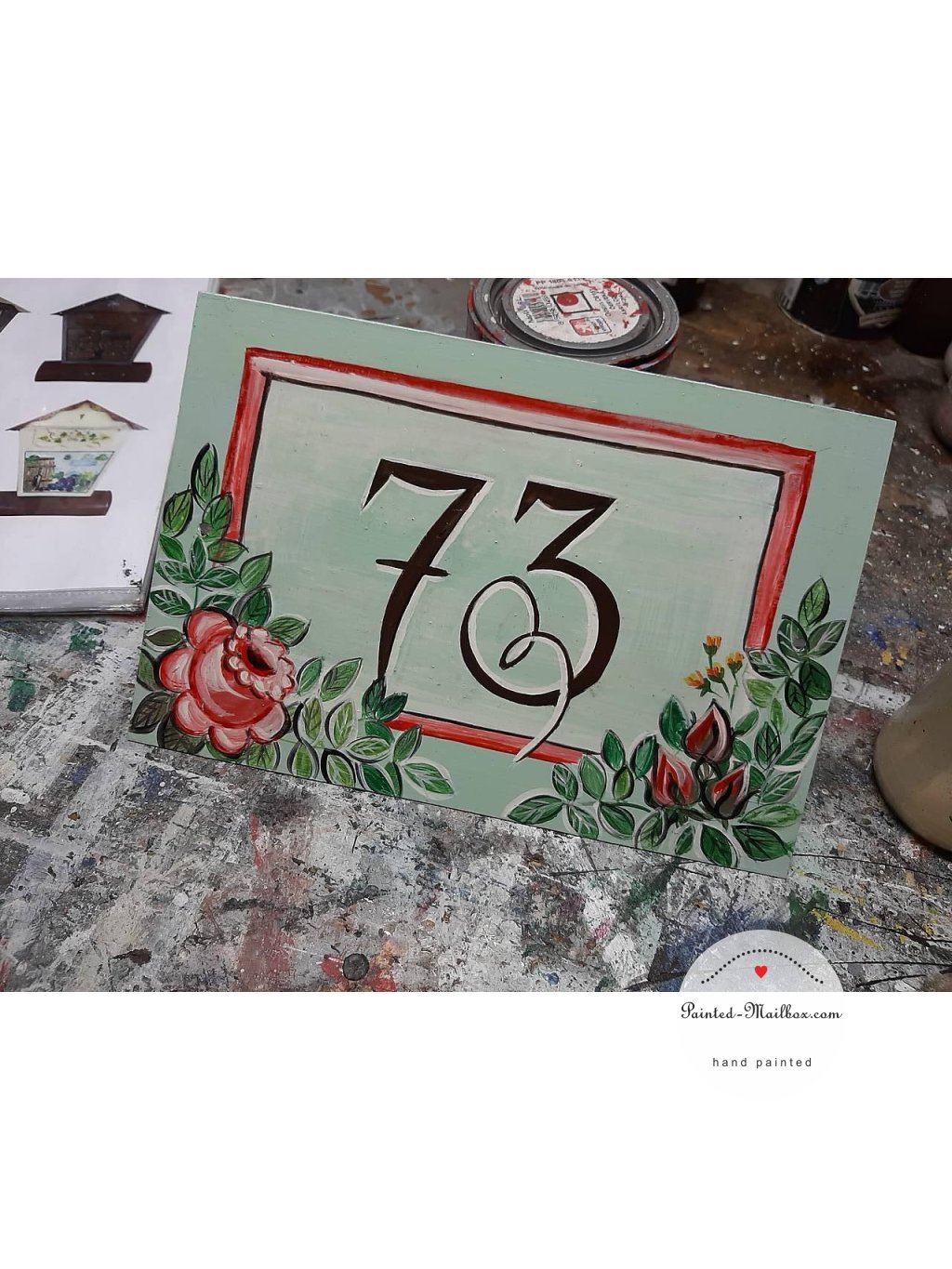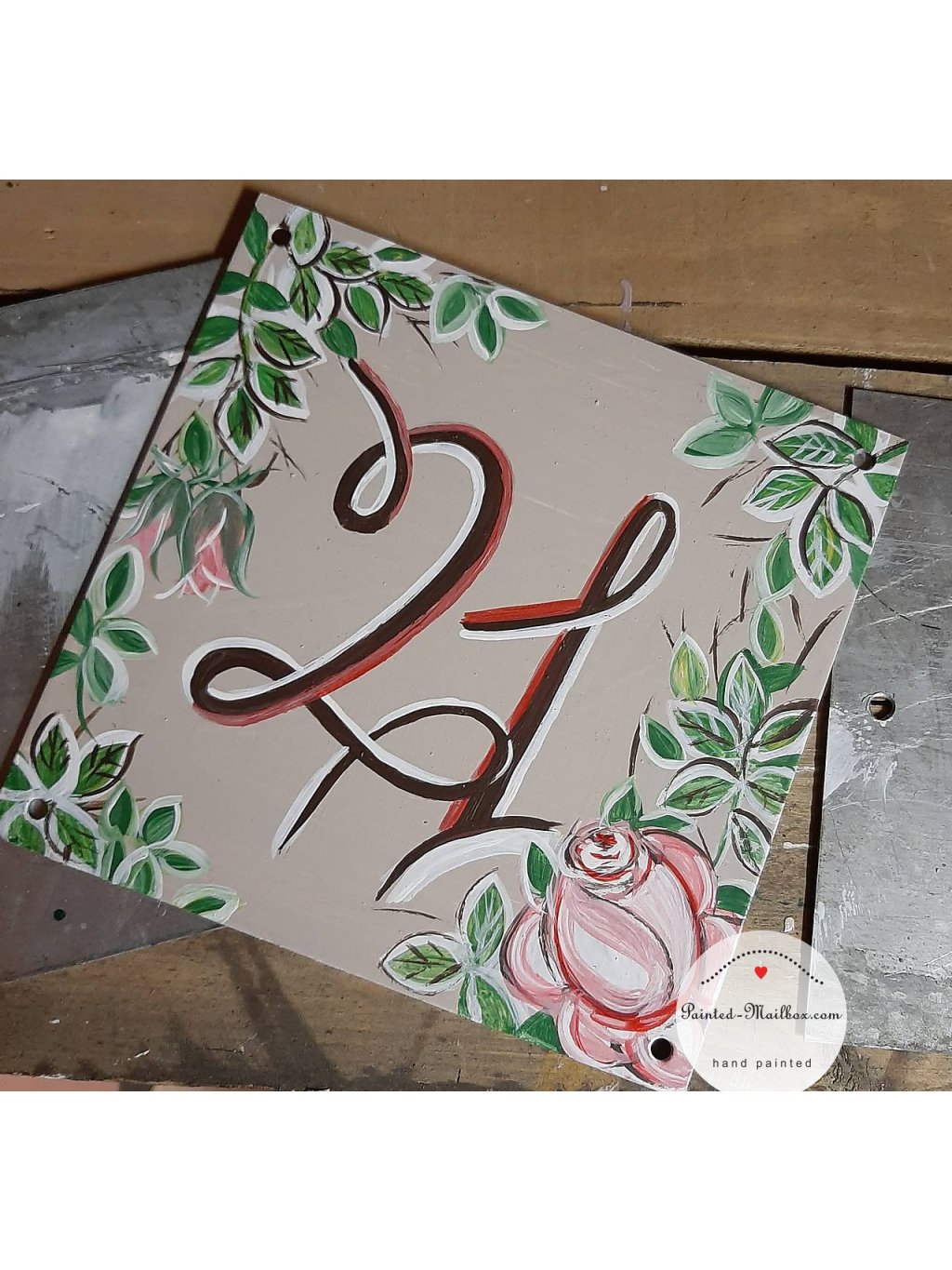 In the same design as your painted mailbox, I will gladly paint a house number or other table (Welcome, etc.) at your request. The size of the steel sheet is 20 x 30 cm / 7,87 x 11,81 inch.