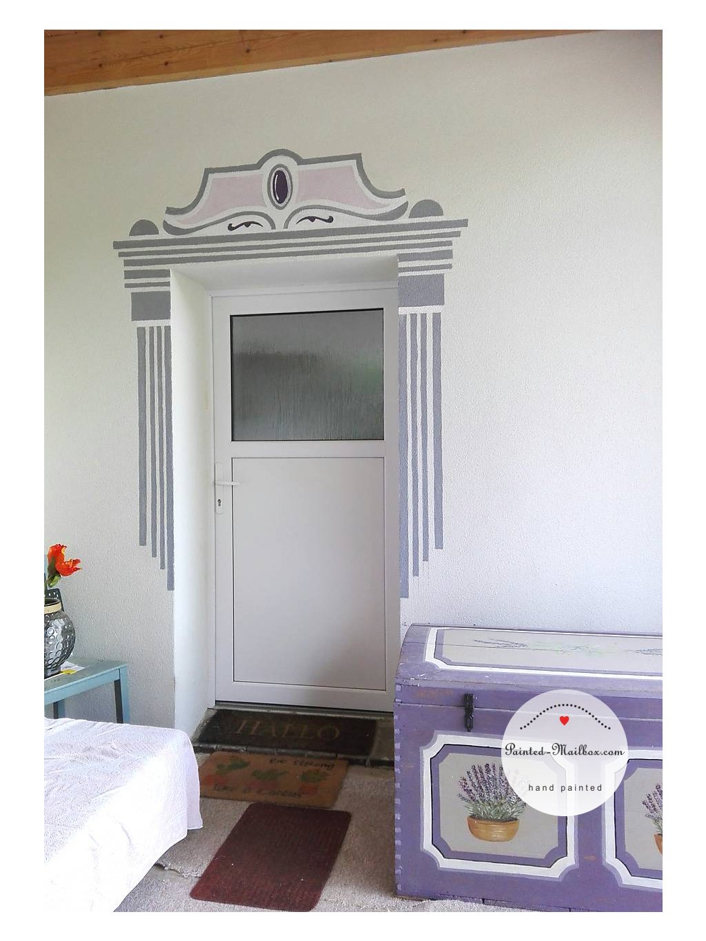 Painting on the facade. Decorative entrance door solution. Custom design and implementation.