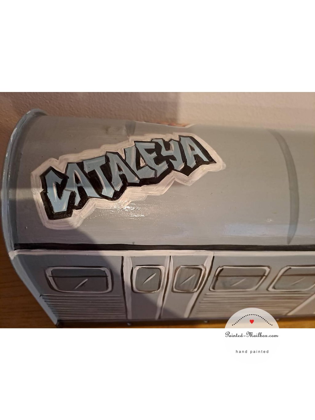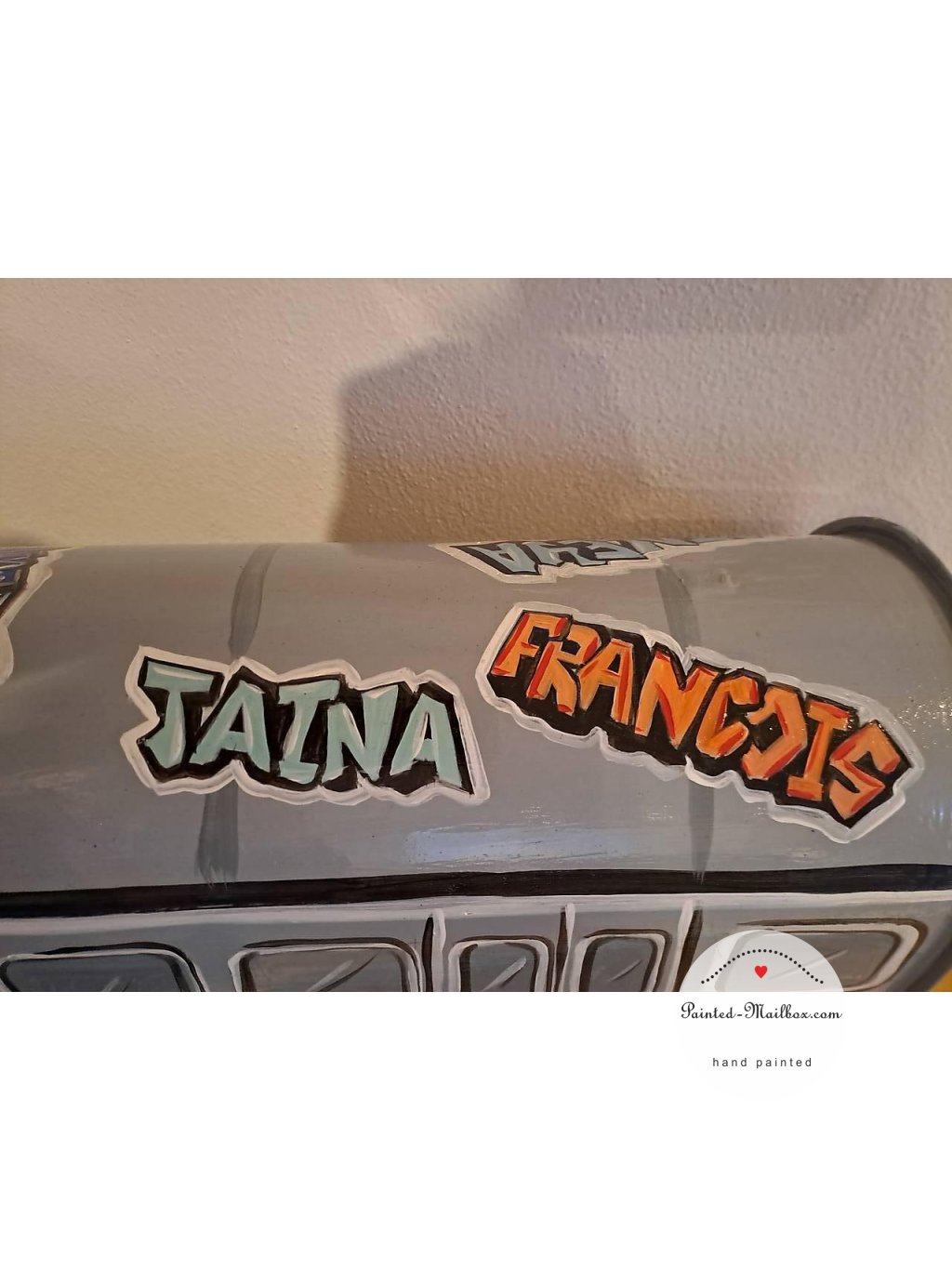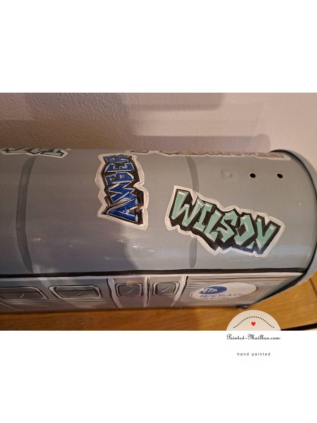 Americká poštová schránka, ručne maľovaná ako newyorské metro ba želanie. Na streche sú mená členov rodiny písané graffiti štýlom. Súčasťou je aj typická červená páčka na boku schránky, len chýba na foto.