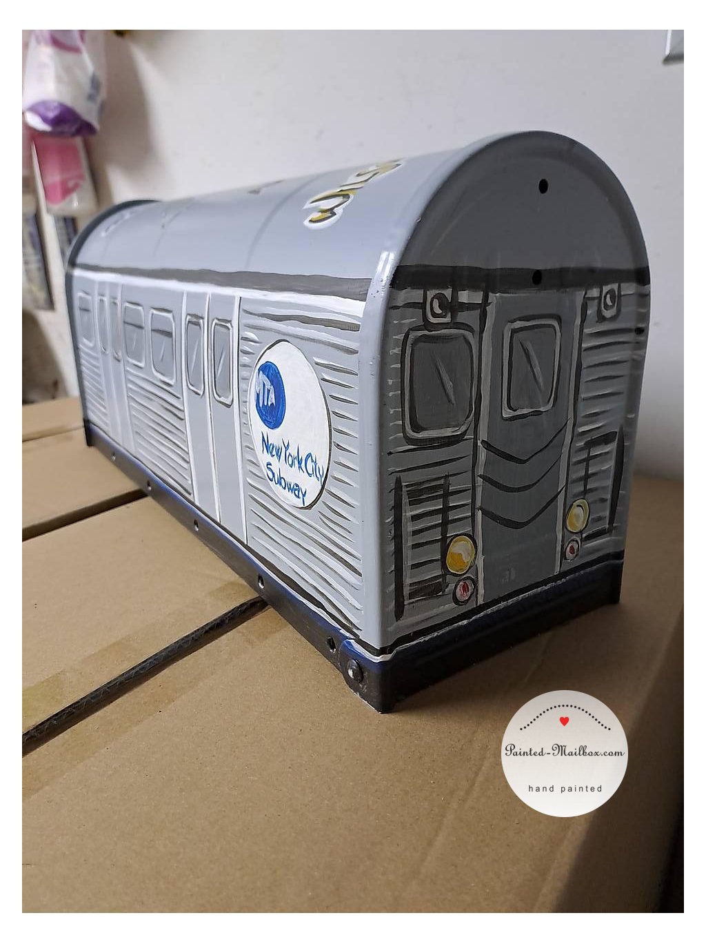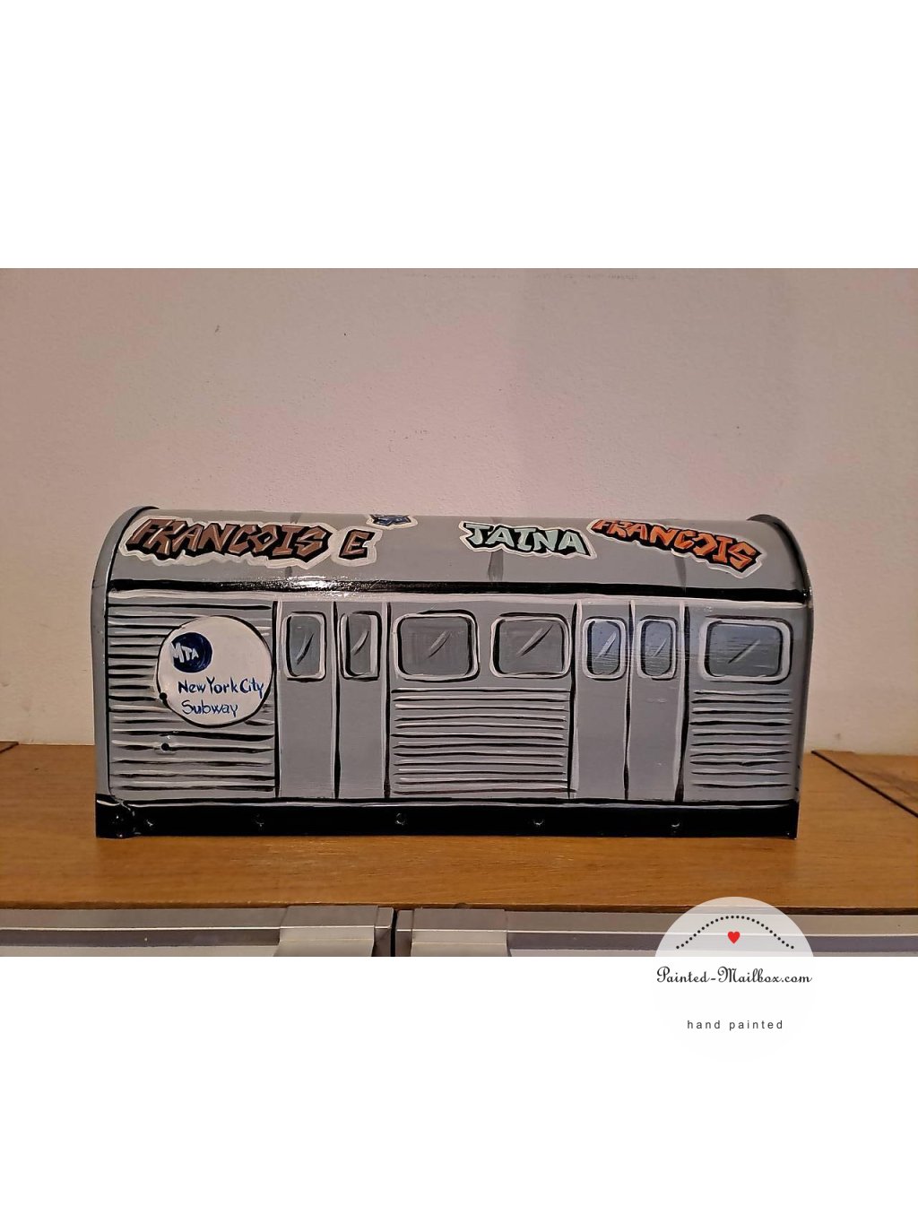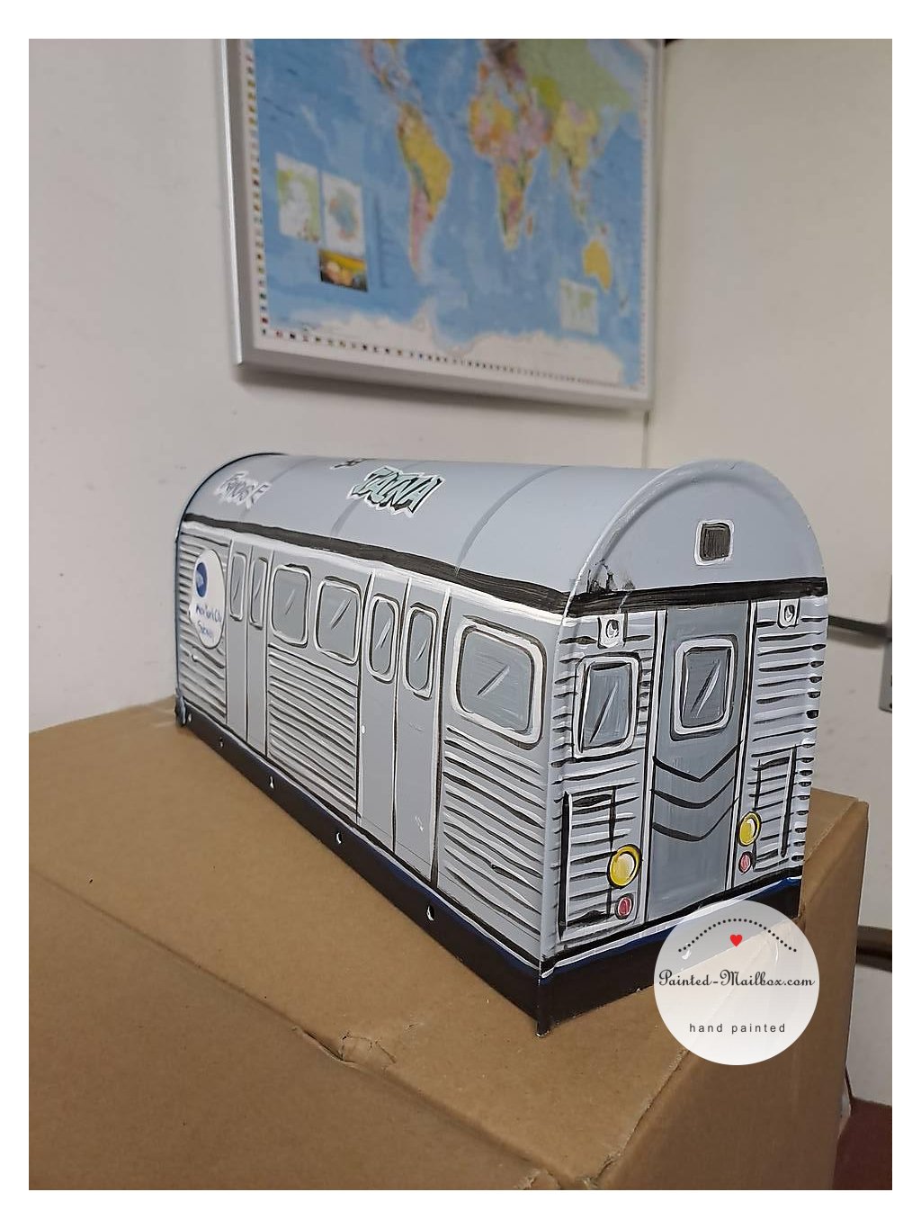 Americká poštová schránka, ručne maľovaná ako newyorské metro ba želanie. Na streche sú mená členov rodiny písané graffiti štýlom. Súčasťou je aj typická červená páčka na boku schránky, len chýba na foto.