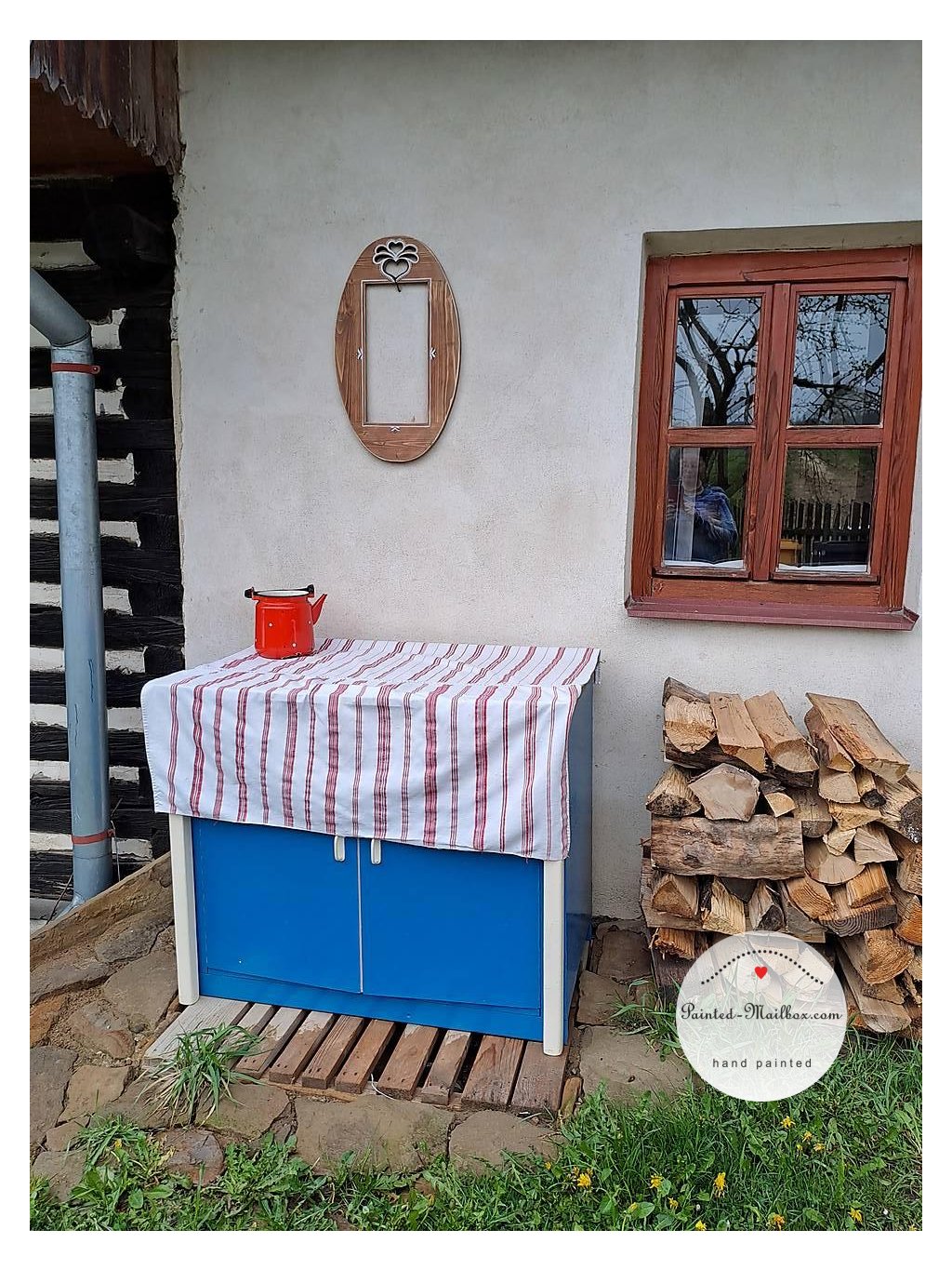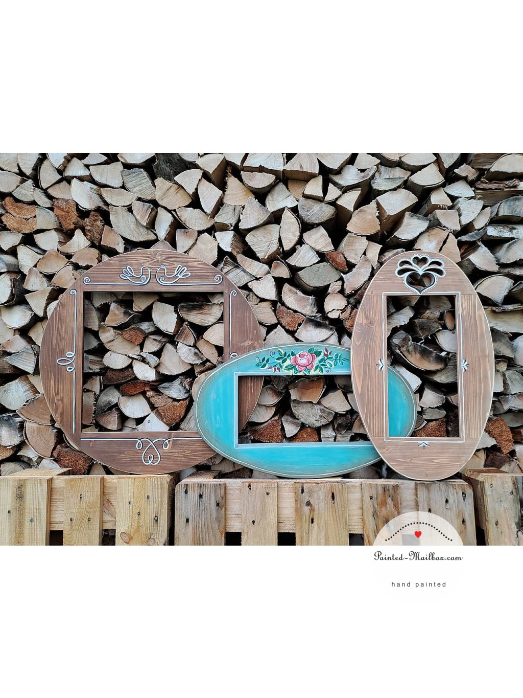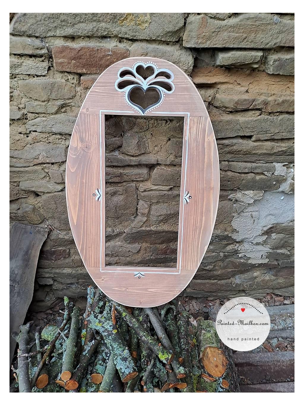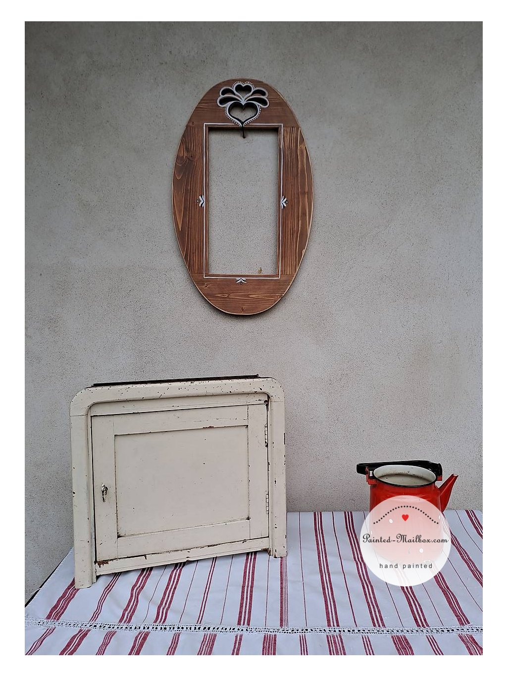 Drevené oválne zrkadlo, maľované. Zrkadlo je súčasťou a je vmontované do otvoru, vzadu je háčik na zavesenie na stenu.