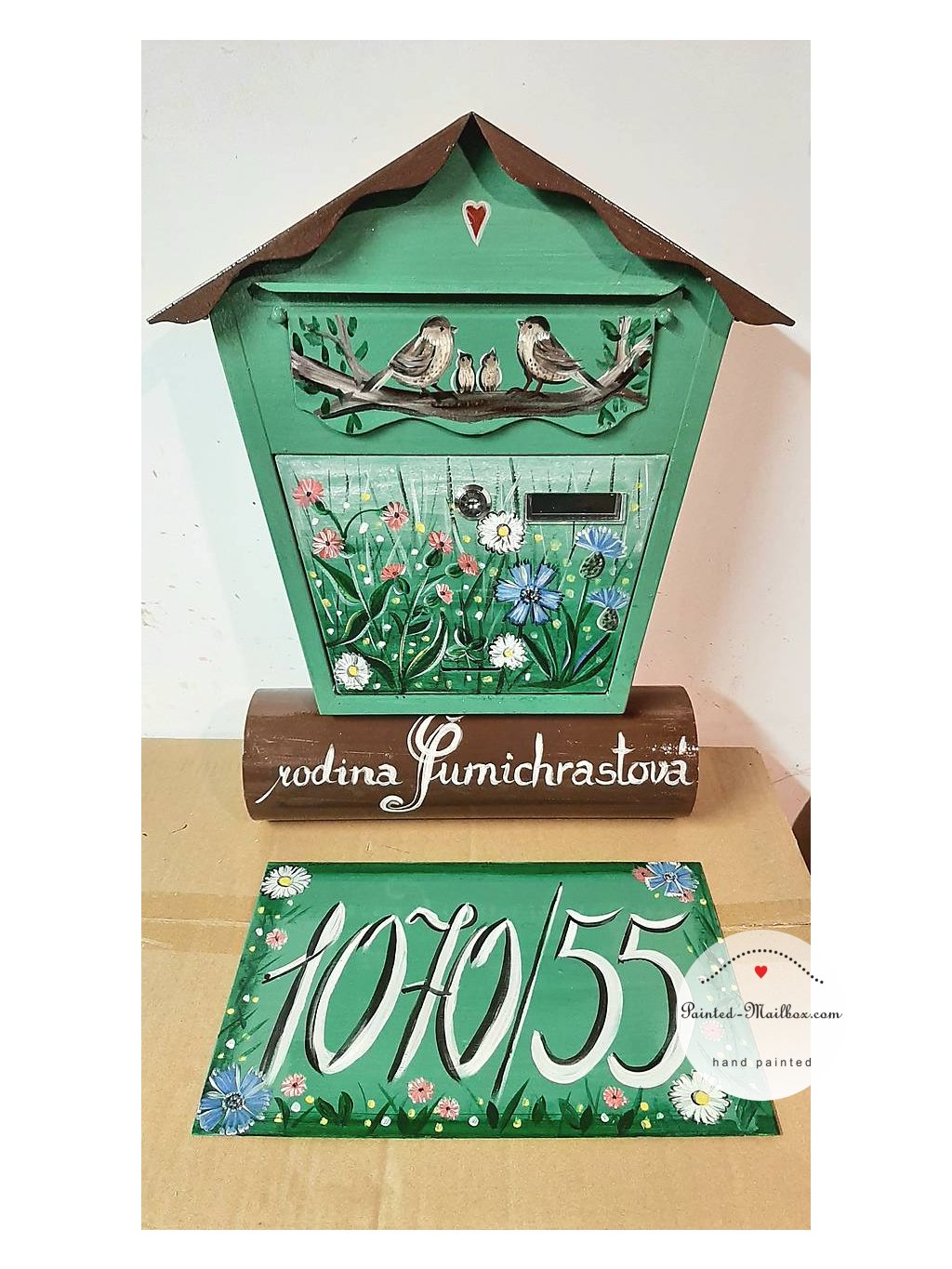• Číslo domu v rovnakom dizajne: V rovnakom štýle ako schránka Vám namaľujem aj číslo domu, na plechovú tabuľku v rozmere 20x30cm.