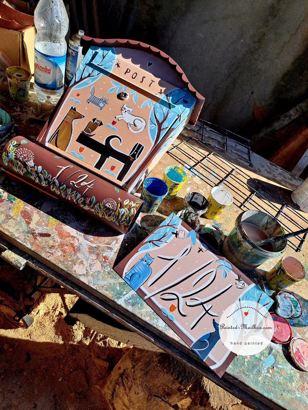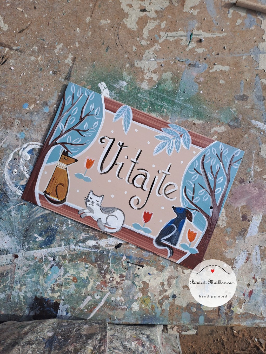 In the same design as your painted mailbox, I will gladly paint a house number or other table (Welcome, etc.) at your request. The size of the steel sheet is 20 x 30 cm / 7,87 x 11,81 inch.